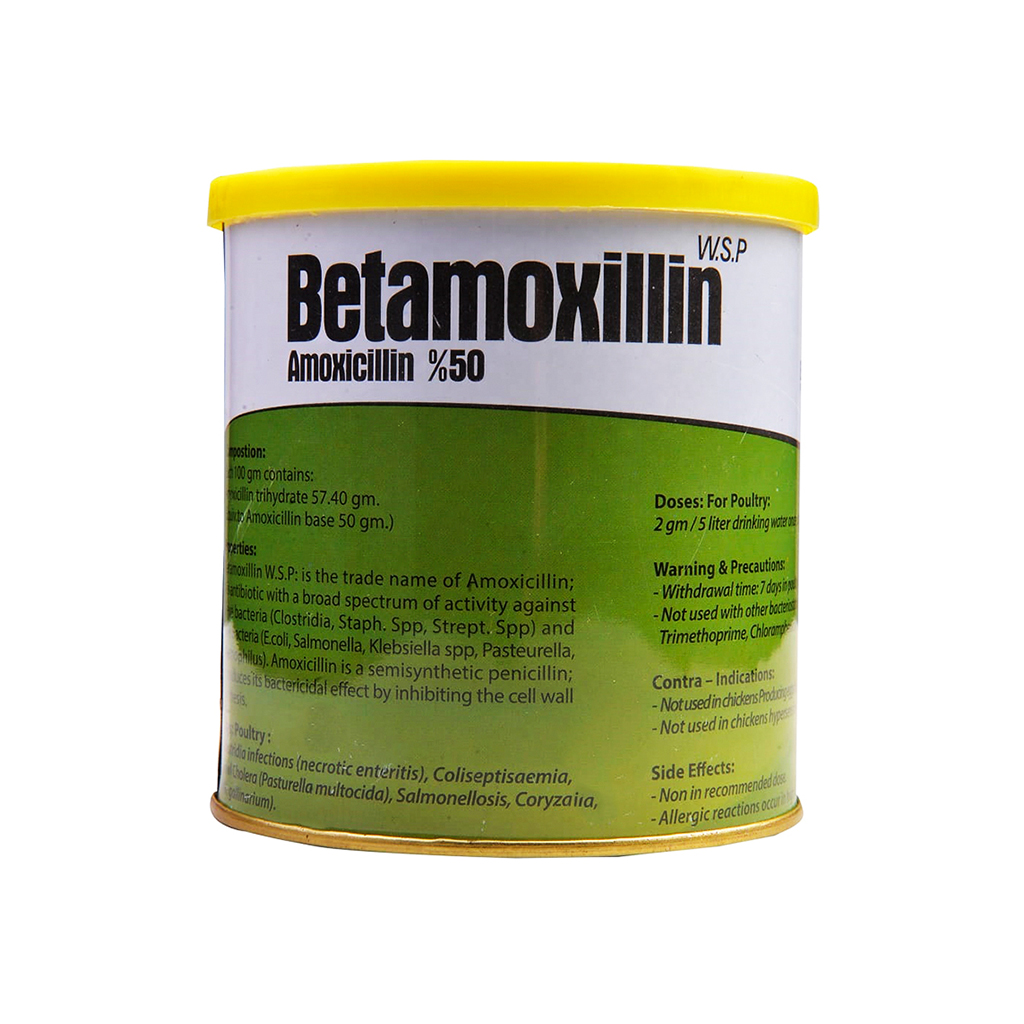 Betamoxillin W.S.P: is the trade name of Amoxicillin; it is antibiotic with a broad spectrum of activity against G+ve bacteria (Clostridia, Staph. Spp, Strept. Spp) and G-ve bacteria (E.coli, Salmonella, Klebsiella spp, Pasteurella, Haemophilus). Amoxicillin is a semisynthetic penicillin; it produces its bactericidal effect by inhibiting the cell wall synthesis.